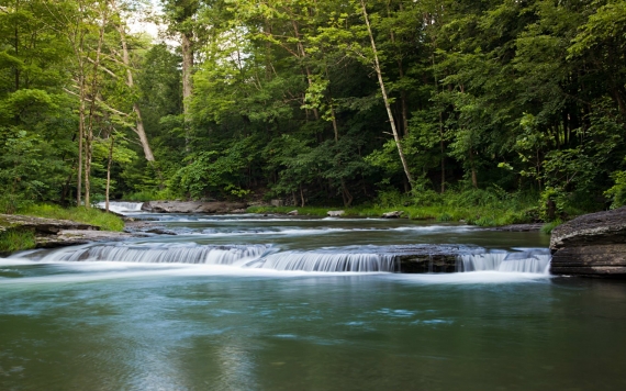 Shallow waterfall with white spraying water surrounded by woods and green leafed trees