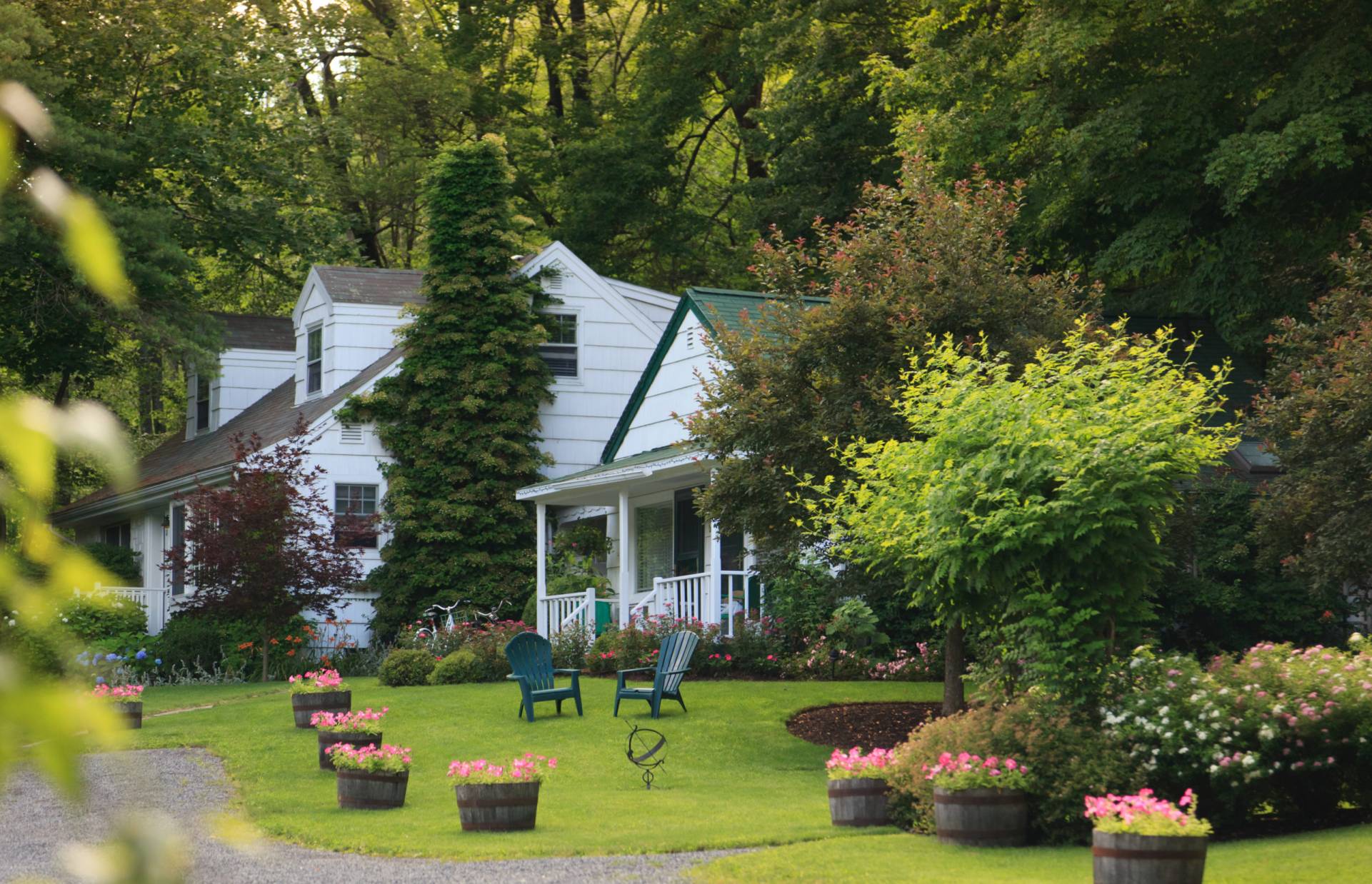 The main room of 14 is spacious and includes a private deck area where you can enjoy the stream. A room with a king bed, white linens, wooden end table and desk, open door and wooden floor.
